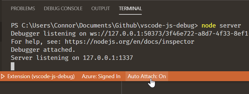 Once enabled, you can toggle Auto Attach by clicking the `Auto Attach: On/Off` button in the status bar on the bottom of your screen. You can also create a one-off terminal for debugging via the `Debug: Create JavaScript Debug Terminal` command.