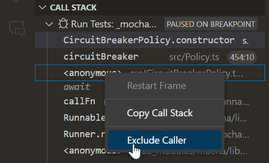 As in most debuggers, you can pause on caught exceptions, but you can also filter the exceptions you want to pause on by checking against the `error` object. In VS Code, you can do this by clicking the pencil icon in the Breakpoints view.